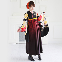 - 黒地に大花が印象的な着物は袴を明るめに!!